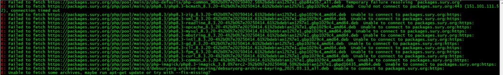 E: Failed to fetch https://packages.sury.org/php/pool/main/p/php8.3/php8.3-bcmath_8.3.20-4%2b0%7e20250414.61%2bdebian12%7e1.gbp1029c4_amd64.deb Could not connect to packages.sury.org:443 (151.101.111.52), connection timed out