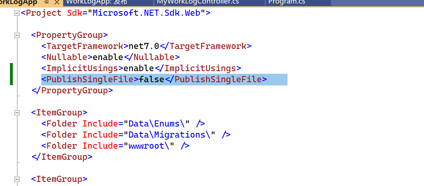 在这个排查页面上可以看到,这个错误是未禁用单文件发布导致的,那么,我们只要在项目文件中禁用单文件发布就行了。